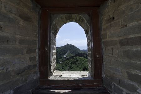 View through a brick window of the Fortress Guard Tower of Mutianyu, a section of the Great Wall of China during summer. Huairou District, Beijing, China