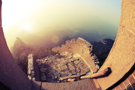 in ruins of the great wall watch tower at sunset