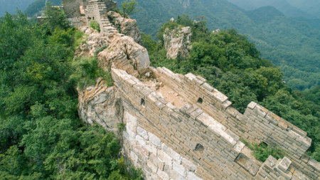 Aerial view of Simatai section of Great Wall of China in its original, un-restored state. Watchtowers perched on mountain peaks, Beijing, China. High quality photo