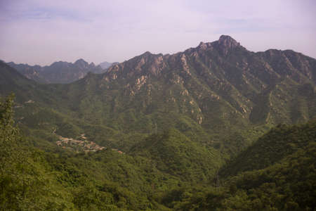 Panorama of Mutianyu, section of the Great Wall of China. Mountains and hills surrounded by green trees during summer. Huairou District, Beijing, China