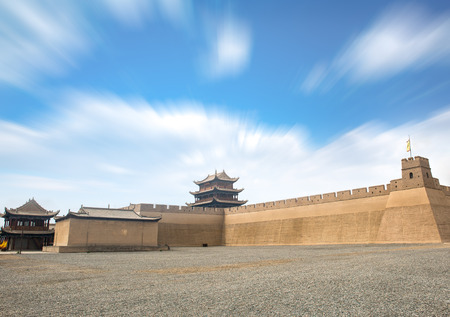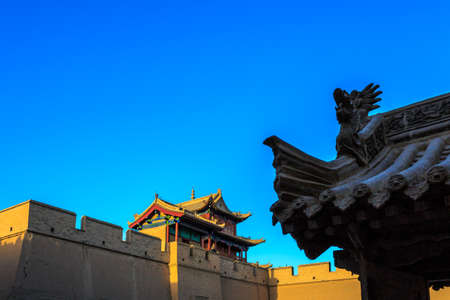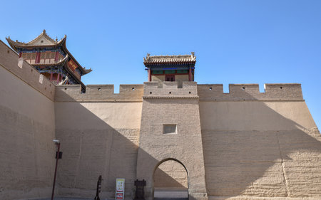 The walls and houses of the Great Wall Jiayuguan Pass in China have remained majestic for more than 2,000 years in Jiayuguan City, Gansu Province, China.