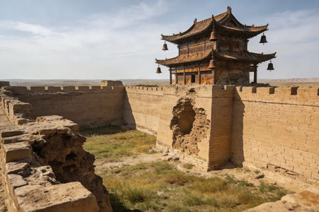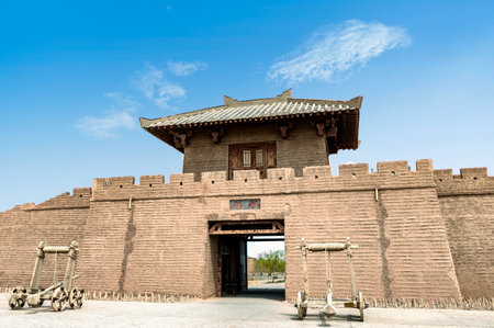 Aug 2017 - Jiayuguan Fort, Gansu, China - Cannon and watchtower of Jiayuguan Fort, China. Known as first pass under the heaven, it was the most western fort of ancient china on the silk road