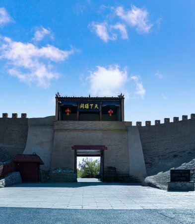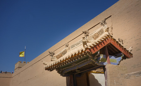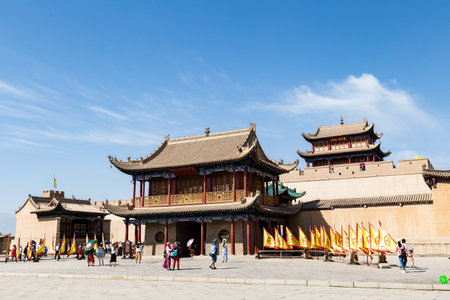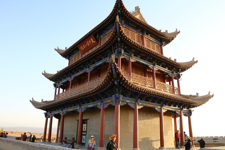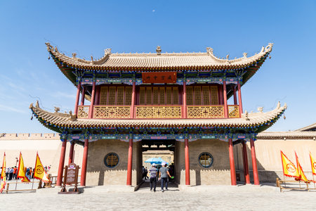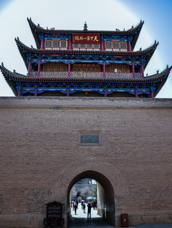 Aug 2017 - Jiayuguan, Gansu, China - Tourists in front of the entry gate of Jiayuguan Fort. Known as first pass under the heaven, it was the western fort of ancient china on the silk road.