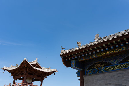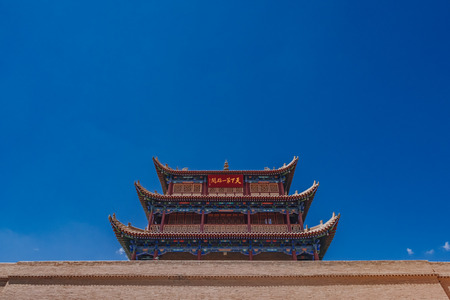 Gate tower building and walls under blue sky at Jiayu Pass, the first frontier fortress of Ming dynasty great wall, in Jiayuguan, China