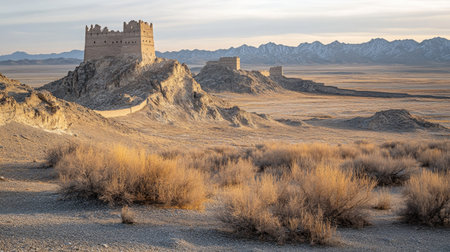 Breathtaking view of ancient fortress ruins on rocky terrain, surrounded by vast desert landscape and majestic mountain range under a dramatic sky.