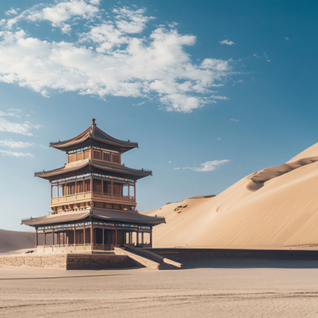 Majestic ancient architecture near sand dunes under a clear blue sky showcasing serenity and solitude