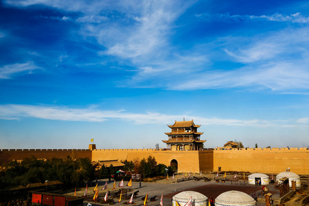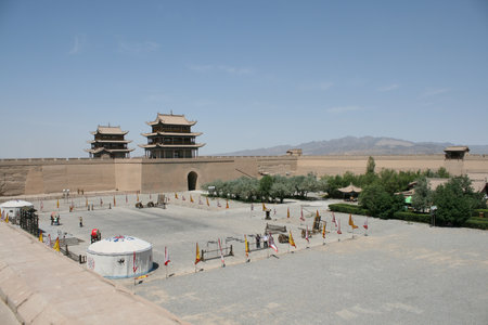 JIAYUGUAN, CHINA - AUGUST 22, 2018: View of Jiayuguan Fort courtyard with yurts, Gansu Province, China