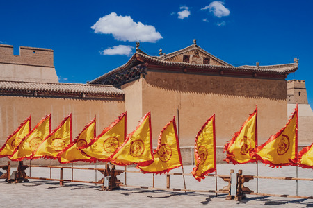 Red and yellow flags in front of traditional Chinese buildings at Jiayu Pass, the first frontier fortress of Ming dynasty Great Wall of China, in Jiayuguan, China