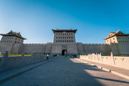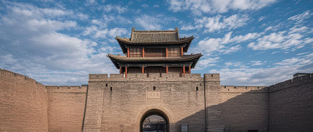 The walls and houses of the Great Wall Jiayuguan Pass in China have remained majestic for more than 2,000 years in Jiayuguan City, Gansu Province, China.