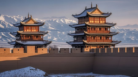 Eaves of a tower in Jiayuguan against distant snow-capped mountains