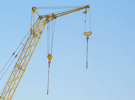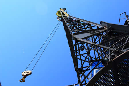 Crane boom with a hook against the blue sky. Hanging on a hook is a metal chain.