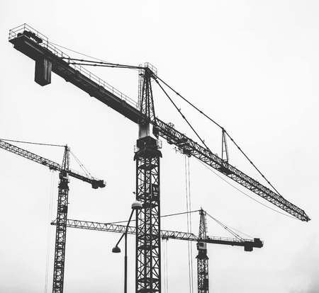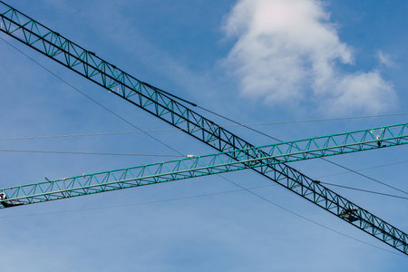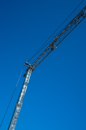 Construction crane. Huge crane against blue sky. Self-erection cranr. Tower crane.