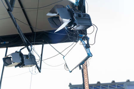 Installation of professional sound, light, video and stage equipment for a concert. Stage lighting equipment is clamped on a truss for lifting. Flight cases with cables.
