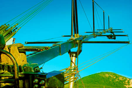 One single simple minimal industrial construction crane object isolated on blue clear sky background, nobody, no people, construction site industry business symbol, abstract concept