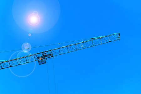 Blue hoisting crane on blue sky as industrial background. Concept of construction, minimalism