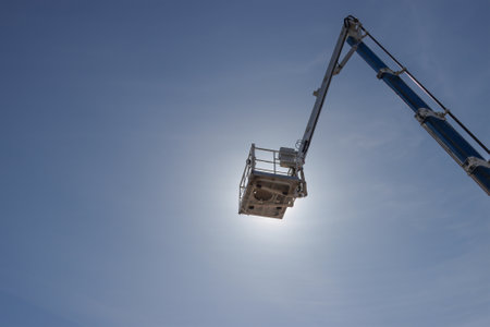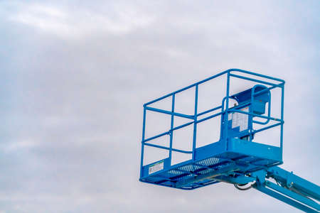 Aerial work platform against cloudy sky in Utah. Close up of an empty aerial work platform used by workers to reach inaccessible high areas against a sky filled with clouds in Eagle Mountain, Utah.
