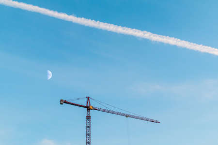 Construction crane, white trace of airplane and moon on the background of cloudy blue sky