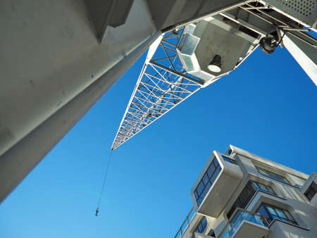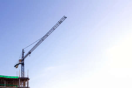 A huge crane at hotel or condo building construction site with blue sky and copy space