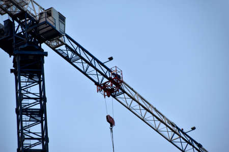 blue crane lifting mechanism with hooks near the glass modern building, crane and hydraulic high lift up to 120 meters.
