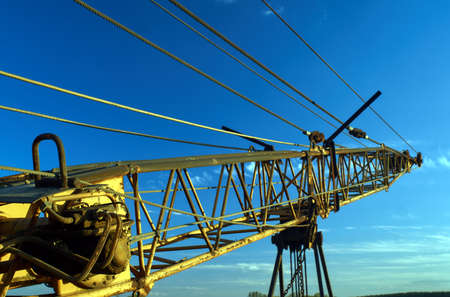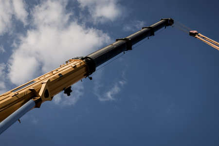 Captivating close-up of a vibrant yellow crane arm, showcasing its intricate design against a serene blue sky. Perfect for themes related to construction and industry.