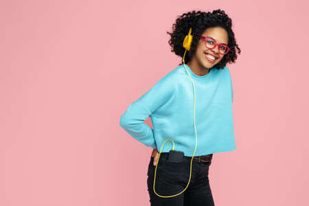 Pretty african american young woman with bright smile listening music in headphones over pink background.