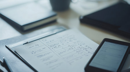 Creative workspace featuring financial documents, a smartphone, and notebooks. Ideal for project planning, organization, and fostering productivity in a calm environment.