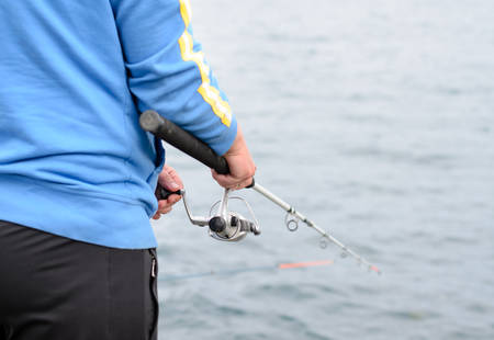 Fisherman hands holding fishing rod close up