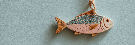 A wooden fish sign with intricate designs hangs from a rope against a pastel wall, evoking a coastal theme that enhances the rooms ambiance with an open edge.
