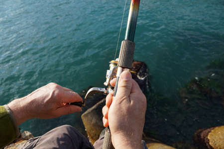 male hands twist spinning reel on sea fishing close-up