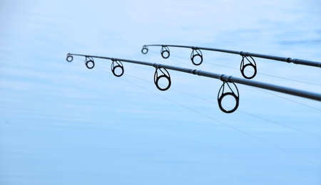 Diminishing perspective of fishing rods over blue water background with copy space, side view