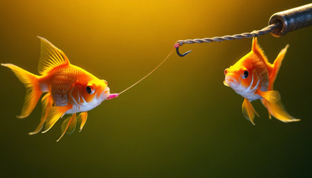 Gold fish and fishing hook on blue background. Fish in the aquarium.