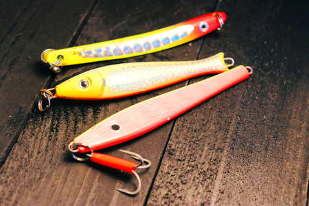 colored fishing lures and jigs for fishing, lie on the table on a wooden background