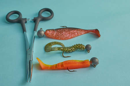 Fishing equipment. Three fishing vibrotails and a pair of scissors to extract the hook close up on a blue background