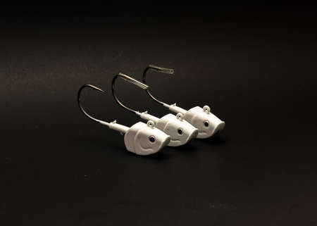 A row of three 2oz white shad jig heads with plastic fishing hook tip cover isolated on black background. Metal bass lure jig heads and sharp hooks
