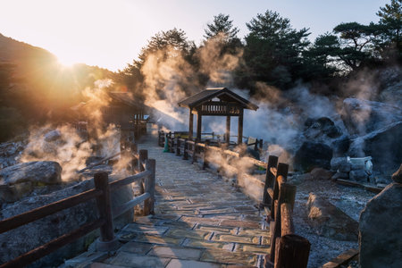 Jigokudani or Hell Valley footpath against sunrise during early morning in Noboribetsu, Hokkaido, Japan