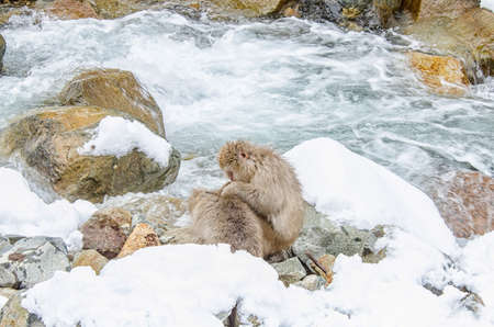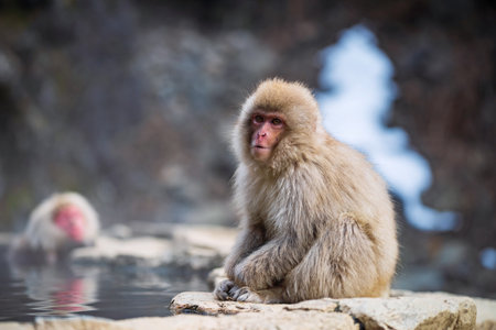 Japanese snow monkey Macaque sit on rock by natural hot spring onsen pool at Jigokudani Park, Yamanouchi, Nagano, Japan. Wild animal in winter season.