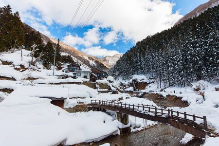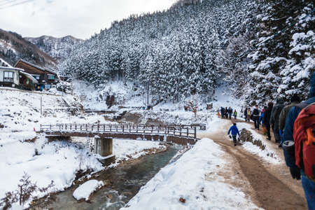 Yudanaka, Japan - January 08, 2020: Winter View to the Small Japanese Village on the Forest Path Way to the Jigokudani Monkey Park