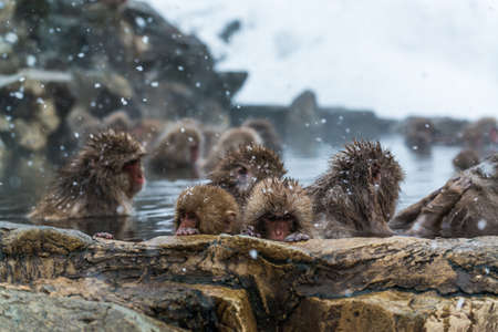Japanese snow monkey (Macaque) relaxes in the hot spring in winter at snow monkey park.