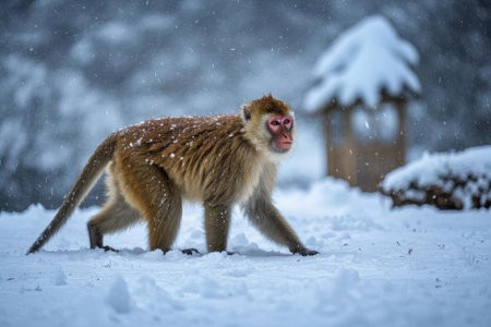 Macaques walking in the snow
