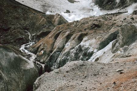 View at volcanic valey with hot springs at Owakudani, Japan