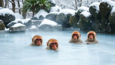 Four monkeys are swimming in a body of water. The water is blue and the snow is on the ground