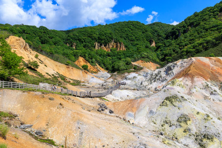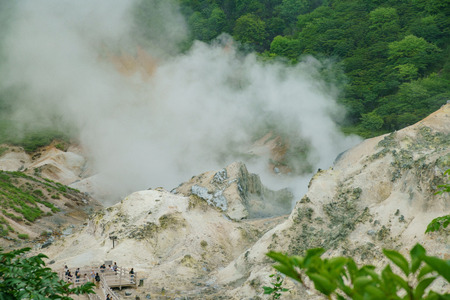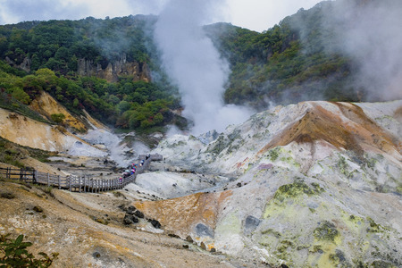 Way to hot spring of Noboribetsu Jigokudani (Hell Valley): The volcano valley got its name from the sulfuric smell, extremely high heat and steam spouting out of the ground in Hokkaido, Japan.