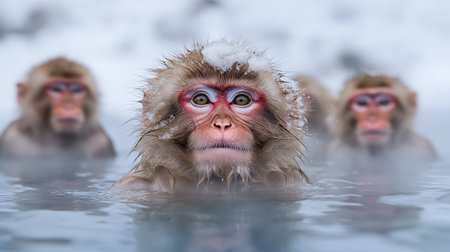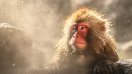 Wild snow monkeys in winter against a background of falling snow. 3D render.