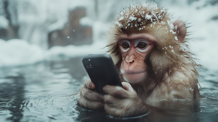 Japanese macaque taking a selfie with his smartphone in a hot spring