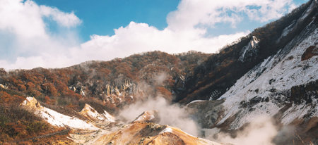 Jigokudani or Hell Valley against blue sky in Noboribetsu, Hokkaido, Japan
