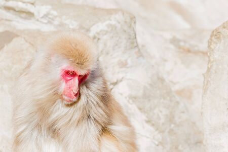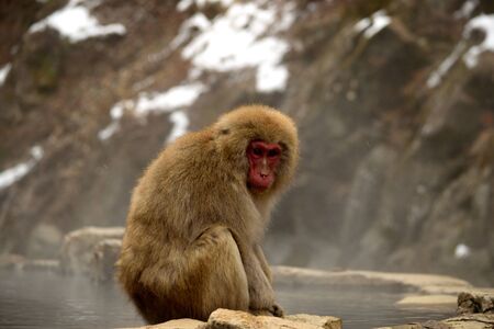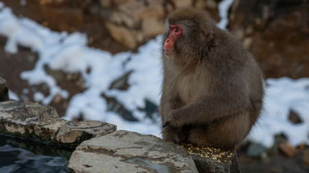 Japanese snow monkey near of onsen hot springs at winter. A wild macaque on rock of warm pool located in Jigokudan Park, Nakano, Japan. Macaca fuscata at winter season in mountain