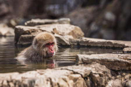 Japanese macaque relaxing in a natural hot spring. This adorable snow monkey enjoys the warm water in Jigokudani Monkey Park, Nagano, Japan. Wildlife, nature, animal.