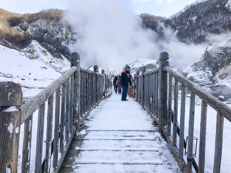 Traveler walking into Jigokudani, known in English as Hell Valley is the source of hot springs for many local Onsen Spas in Noboribetsu, Hokkaido, Japan in winter