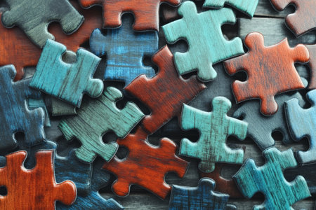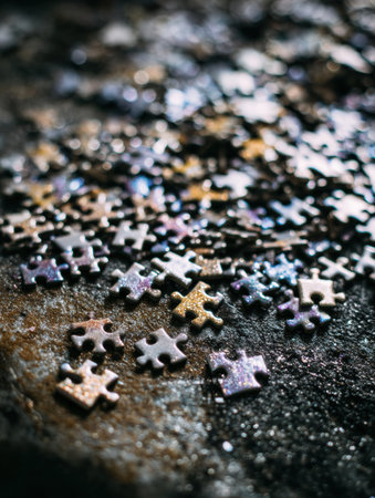 A close-up image showcasing interlocking puzzle pieces on a dark surface, emphasizing texture, color variations, and subtle light reflections to create an intriguing atmosphere.