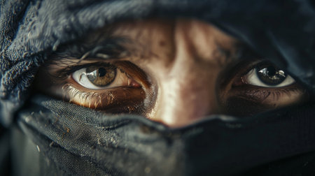 Mysterious eyes peering through dark fabric